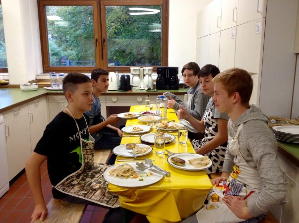 Die NWT-Gruppe (Ernährung) der Klasse 9b war am Freitag, dem 23. Oktober 2015, bei einem Workshop an der Fachschule für Landwirtschaft zum Thema "Essen - prima Klima". Nach einer kurzen Begrüßung wurden die Schüler in die Lehrküche geführt und haben dort in Kleingruppen aus regionalen und saisonalen Zutaten ein leckeres Essen zubereitet. Es gab Kartoffelküchle, mit Gemüse gefüllte Pfannkuchen, ein Salat mit Rote Bete und einen Apfel-Karottensalat. Nach dem Kochen wurden die Speisen gemeinsam verzehrt. Einige waren überrascht wie gut es geschmeckt hat. Nachdem alles wieder sauber war ging es mit dem Lernzirkel weiter. An den einzelnen Stationen erhielten die Schüler viele Informationen über den Zusammenhang zwischen den Lebensmitteln und unserem Klima. Es ging dabei hauptsächlich um den CO2-Abdruck. Aber auch verschiedene (Umwelt-)Siegel, das Einkaufsverhalten und der Saisonkalender von regionalem Obst und Gemüse wurden thematisiert.