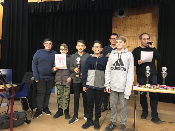 Felix Hagenmeyer (Klasse 8d), Rodrigo Melzig (Klasse 7c), Tobias Ellerichmann (Klasse 6b), Deniz Ihtiyar (Klasse 7c) und Colin Ensslinger (Klasse 7a). Bei diesem Turnierformat werden immer nur 4 Spieler pro Mannschaftsspiel im Schnellschach eingesetzt.