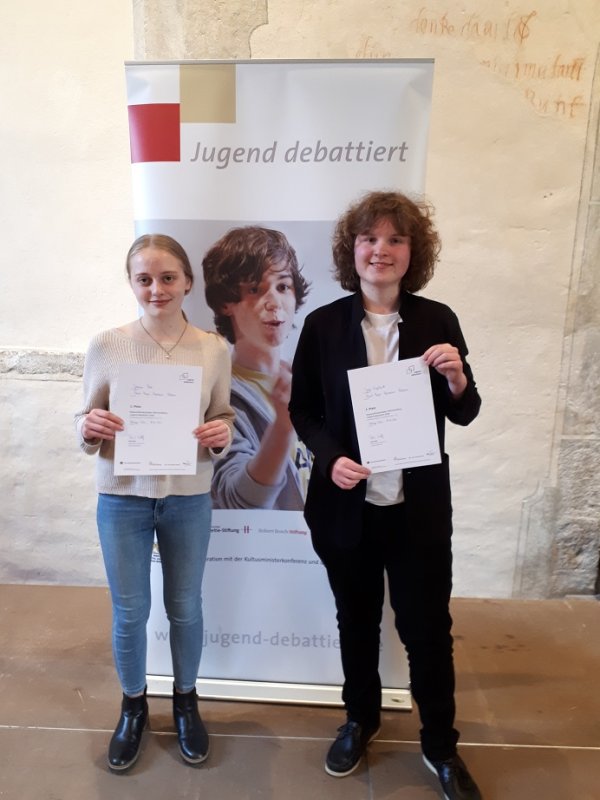 Im Regionalfinale am 14.Februar in der Peterskirche in Vaihingen/Enz wurde in der Altersklasse 2 die Frage debattiert, ob eine Stadt oder Gemeinde den Klimanotstand ausrufen soll. Nach der Qualifikation auf Platz 2 und 3 gelegen argumentierte Johanna sehr überzeugend auf der pro-Seite und Jonas sehr anschaulich und engagiert auf der contra-Seite. Johanna konnte sich im Finale noch von Platz 2 auf Platz 1 steigern, Jonas verteidigte seinen sehr guten 3. Platz. Damit ist Johanna zum 2. Mal in Folge Regionalsiegerin bei Jugend debattiert, fährt zum Regionalsiegerseminar und tritt in der Landesqualifikation Baden-Württemberg am 27. März in Stuttgart an, Jonas ist der Nachrücker für das Seminar und die Landesqualifikation. Herzlichen Glückwunsch allen Teilnehmern, die das RMG erneut so positiv beim Regionalwettbewerb vertreten haben!