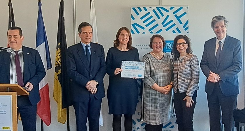 Von links nach rechts: Generalkonsul M. de Maisonneuve, M. Brandouy, Direktor France Education International, Silke Würtemberger, Ministerin Theresa Schopper, Schulleiterin Antje Kerdels, S.E. Delattre, französischer Botschafter in Deutschland