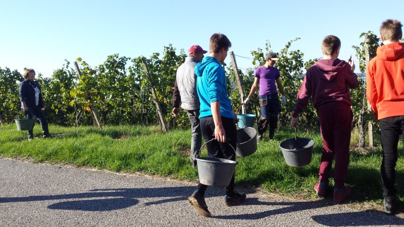 Im Rahmen der Unterrichtseinheit „Einheimische Nutzpflanzen“ führten wir, die Klasse 8d, in Begleitung unseres Biologielehrers Herrn Bindereif ein Weinlesepraktikum bei der Familie Birkert in Bretzfeld-Adolzfurt durch. Zuvor lernten wir im Unterricht etwas über den Aufbau, die Besonderheiten, die Eigenschaften und die Schädlinge der Weinrebe kennen. Außerdem behandelten wir die Tätigkeiten des Winzers im Laufe eines Jahres und den Weg von den Beeren zum Wein. Vor Ort fuhren wir vom Weingut mit Traktor und Transporter zum Weinberg. Dort wurden uns kurz die wichtigsten Regeln erklärt und dann konnten auch schon alle -inklusive Lehrer- anfangen zu arbeiten. Nach 3,5 Stunden waren 2,5 Tonnen Schwarzrieslingtrauben gelesen und wir konnten uns beim abschließenden Mittagessen in der Besenwirtschaft Birkert für den Heimweg stärken.