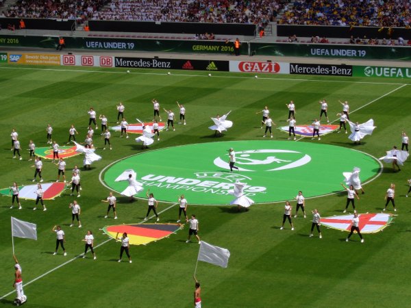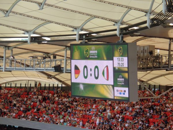 Einen Tag nach dem Finale der Fußball-EURO 2016 in Paris startete die Europameisterschaft der U19- Junioren mit dem Eröffnungsspiel zwischen Deutschland und Italien in der Mercedes-Benz Arena Stuttgart. Das Robert-Mayer-Gymnasium war dabei, mit 24 Lehrerinnen und Lehrern über 200 Schülerinnen und Schülern der Klassen 8 bis 10. Größtenteils In Nationaltrikots und bestückt mit schwarz-rot-goldenen Fahnen ging es nach der großen Pause zunächst zu Fuß zum Heilbronner Hauptbahnhof und von dort mit dem Zug nach Stuttgart/Hauptbahnhof, wo eine Sonder-S-Bahn auf uns wartete und uns direkt vor das Stadion brachte. Mit uns waren noch weitere 54 000 Zuschauer da, was „Weltrekord“ für Juniorenfußballspiele bedeutete. Von der Haupttribüne aus hatten wir beste Sicht, bei bester Stimmung. Leider brachte es die deutsche Mannschaft nicht fertig ihre zahlreichen Torchancen zu nutzen, so dass kam, was kommen musste. Bei ihrem einzigen Vorstoß vor das deutsche Tor schoss ein italienischer Stürmer dem deutschen Verteider den Ball aus kurzer Distanz an den Arm. Den umstrittenen Handelfmeter verwandelten die Italiener zum 0:1. Dabei blieb es bis zum Schlusspfiff. Trotz dieser Niederlage und des etwas beschwerlichen Rückweges in überfüllten Zügen war es für alle RMGler ein tolles Erlebnis einmal in einem ausverkauften Stadion ein Länderspiel der U19-EURO zu verfolgen.